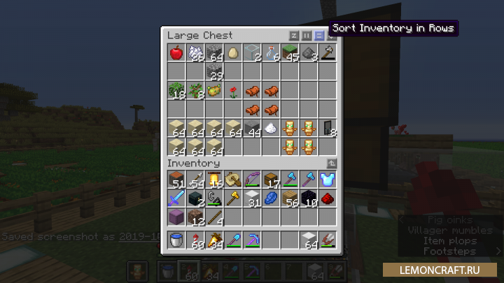 Мод на сортировку инвентаря Inventory Profiles добавляет в игру три кнопки, которые позволят произвести быструю сортировку инвентаря вашего персонажа или его сундука. Вы сможете сортировать товар полностью, по колонкам и по рядам. Так же в игре появится специальный интерфейс (открывается сочетанием клавиш R + C), для управления всем процессом.
